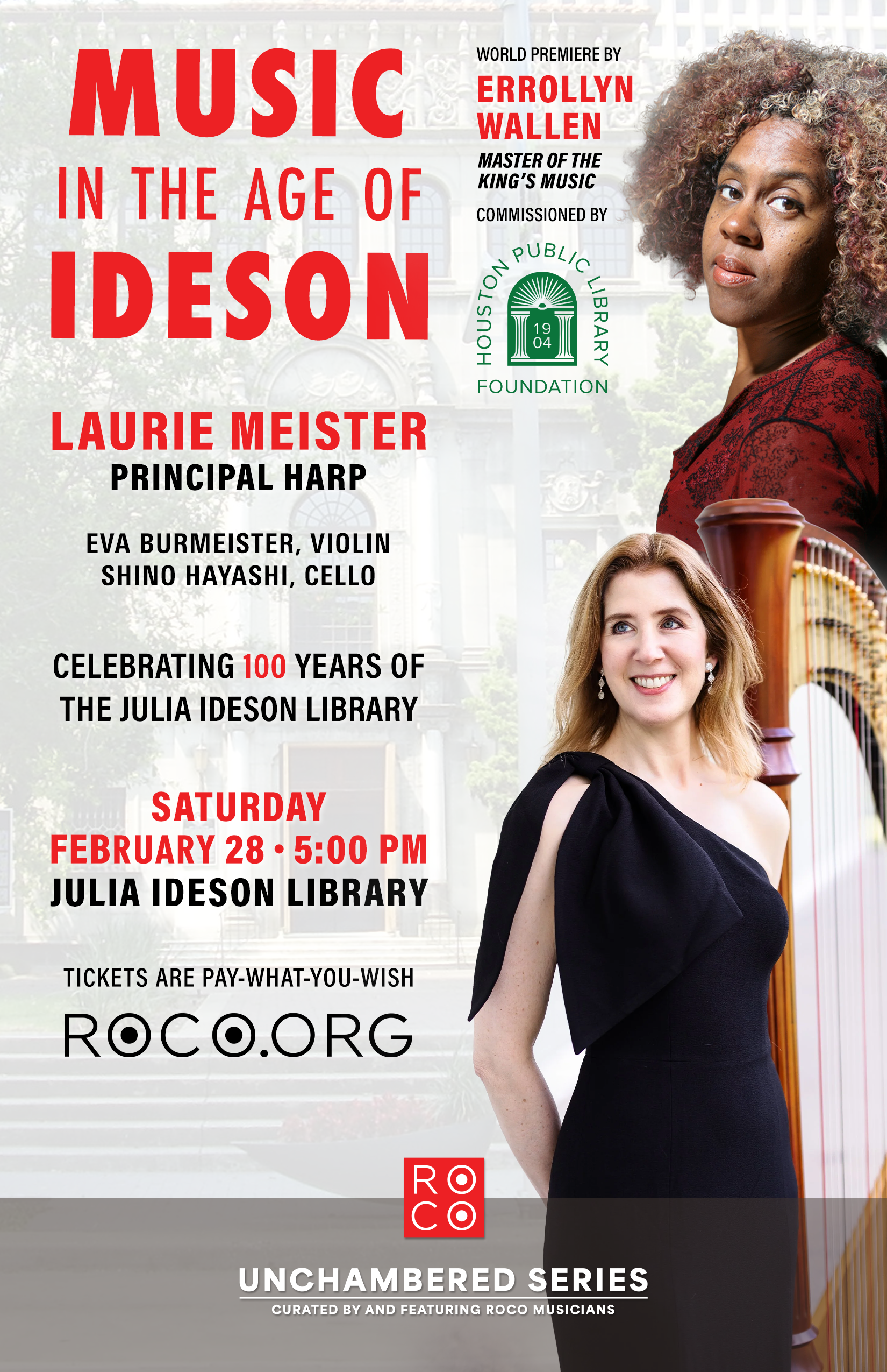 Join the Houston Public Library Foundation as we partner with ROCO to present an intimate performance featuring harpist Laurie Meister, in celebration of the 100th anniversary of the Julia Ideson Library. Set in one of Houston’s most iconic historic spaces, this program weaves together music and memory to highlight the expressive beauty of the harp and the building’s storied past.